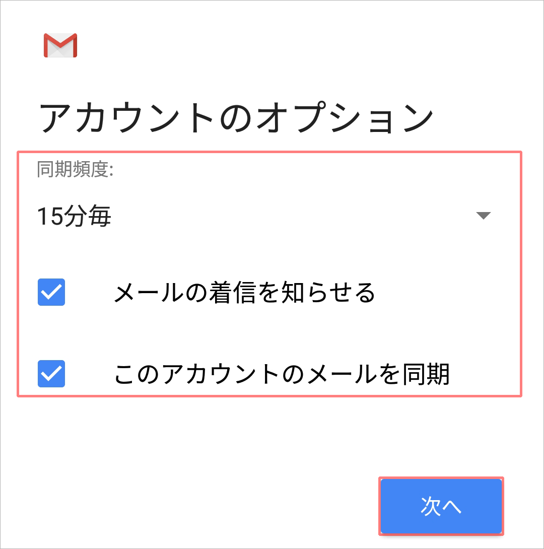 アカウントのオプション画面が表示されたら、任意に設定して[次へ]ボタンをタップします。