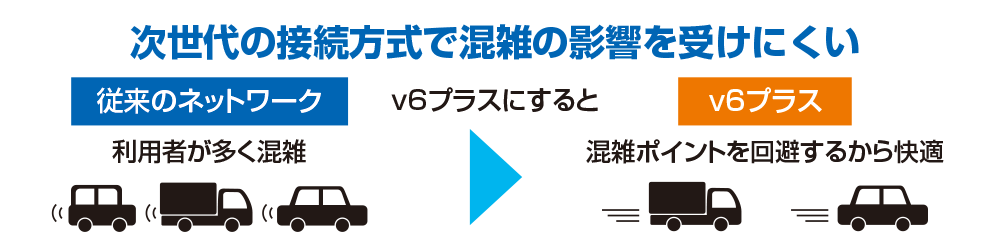 「V6プラス」とは株式会社JPIXの「v6プラス」 を用いた「IPoE方式」によるIPv6インターネット接続とIPv6ネットワーク上で IPv4インターネット接続も実現するIPv4とIPv6が共存する接続サービスです。IPv6(IPoE)接続サービスをご利用いただく事により、従来の接続方式(IPv4 PPPoE方式)よりも快適にインターネットをご利用いただけるようになります。