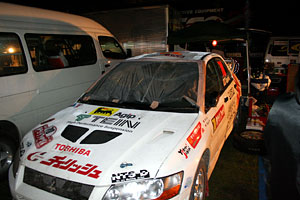夜のサービスパークにて。フロントガラスが破損した田口・廣田組の車両