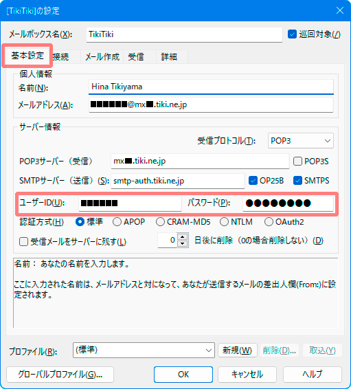 ※TikiTikiインターネットのPOPサーバは暗号化には対応していません。「POP3S」にはチェックを入れないでください。