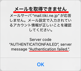 「メールを取得できません(Authentication failed)」と表示される